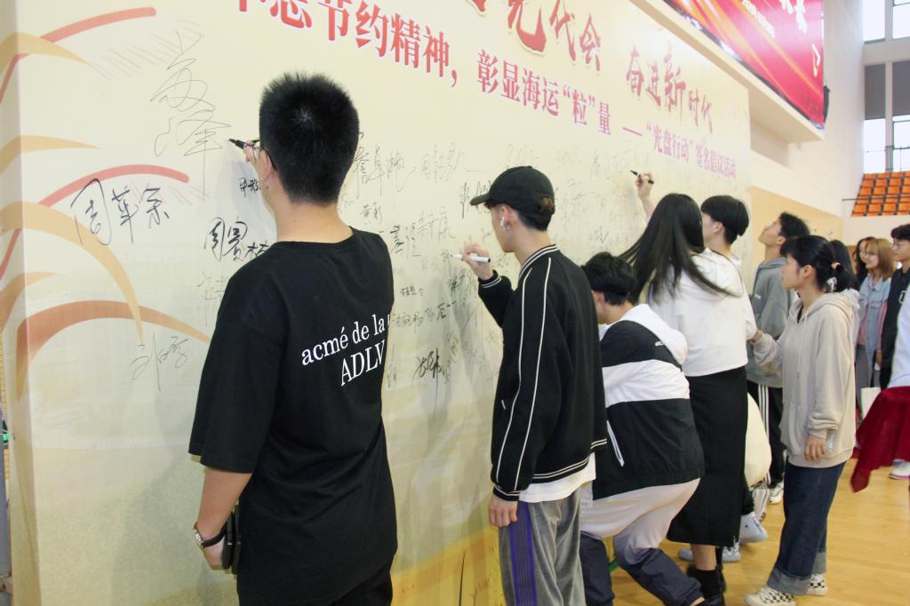 “不忘节约精神,彰显海运“粒”量——“光盘行动”签名倡议活动”中,出席领导、教师党员代表、学生代表纷纷在签名墙上签上自己的名字,表达“光盘行动”的决心,推动师生员工带头做厉行节约的参与者、反对浪费的践行者、文明用餐的监督者,形成节俭养德教育的浓厚氛围。