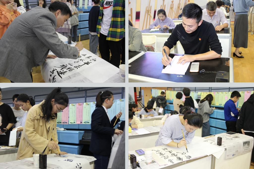 在“党旗飘扬 笔墨添彩”书法大赛现场,师生代表以习近平新时代中国特色社会主义思想金句、党章党规、入党誓词以及爱国主义等内容为主题,认真书写书法作品,抒发各自价值追求和情感认识,进一步引导广大师生不忘初心、牢记使命,坚定理想信念。(组织部、纪委办)