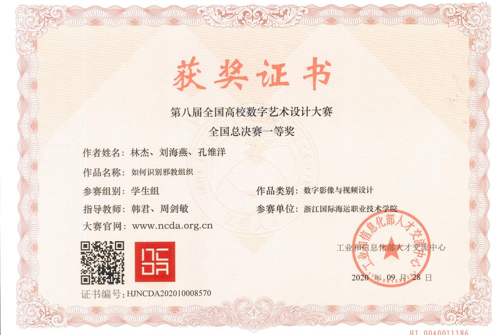 在2020年9月举办的第八届全国高校数字艺术设计大赛中,由我校港口管理学院林杰、刘海燕和孔维洋等学生创作,韩君、周剑敏老师指导的作品《如何识别邪教组织》脱颖而出,荣获大赛一等奖。据悉,本届赛事共有全国1106所高校参赛,共征集作品60113,大赛一等奖作品占作品总数的2.25%。