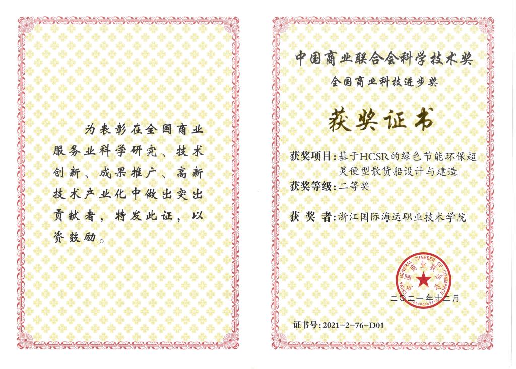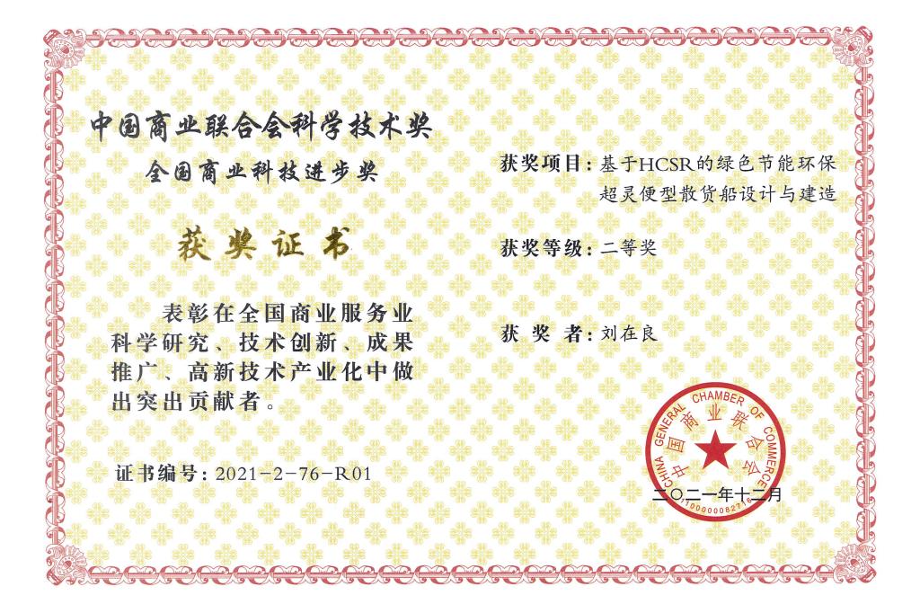 近日,中国商业联合会在北京通过线上、线下相结合的方式召开了2022年全国商业科技质量大会,会上颁发了2021年度中国商业联合会科学技术奖。由我校海洋装备工程学院正高级工程师刘在良主持,学校与杭州电子科技大学、扬帆集团股份有限公司、浙江嘉蓝海洋电子有限公司、舟山中远海运重工有限公司联合完成的研究成果“基于HCSR的绿色节能环保超灵便型散货船设计与建造”,获2021年度中国商业联合会科学技术奖——全国商业科技进步奖二等奖。