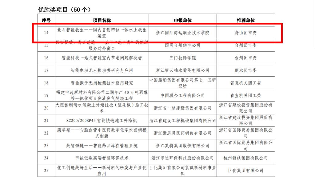 近期,由共青团浙江省委、浙江省国资委联合主办,浙江省能源集团有限公司承办的第五届浙江省青工创新创效大赛决赛在杭州顺利举行。经过激烈角逐,我校北斗智能救生——国内首创四位一体水上救生装置项目喜获优胜奖。