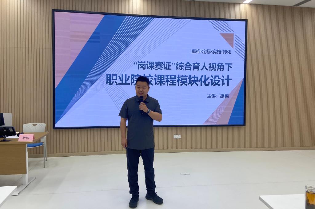 来自安徽财贸职业学院的胡杨副教授以《“岗课赛证”综合育人视角下职业院校课程模块化设计》为题,分别从“课程模块化设计的概念”、“课程模块化设计的典型结构”、“公共基础课程模块化设计”、“专业课程模块化设计”、“课程模块设计样表撰写”等五个方面入手,由浅入深地讲解了课程模块化设计的一系列内容,胡杨副教授幽默的表达风格吸引了在场的每一位老师,令在座青年教师们受益匪浅。