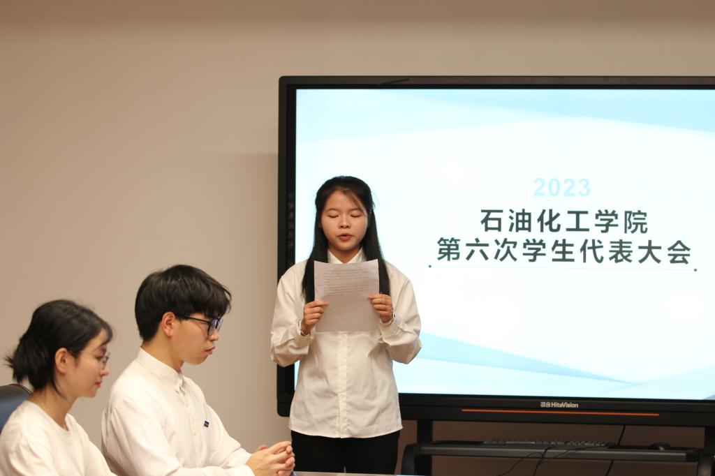 随后学生代表审议通过选举办法、监票人、计票人。在监票人的监督下,选举产生石油化工学院第五届学生委员会委员、学生会主席团以及校第六届学生委员会委员候选人、主席团成员候选人,并当场宣布了当选者的名单。
