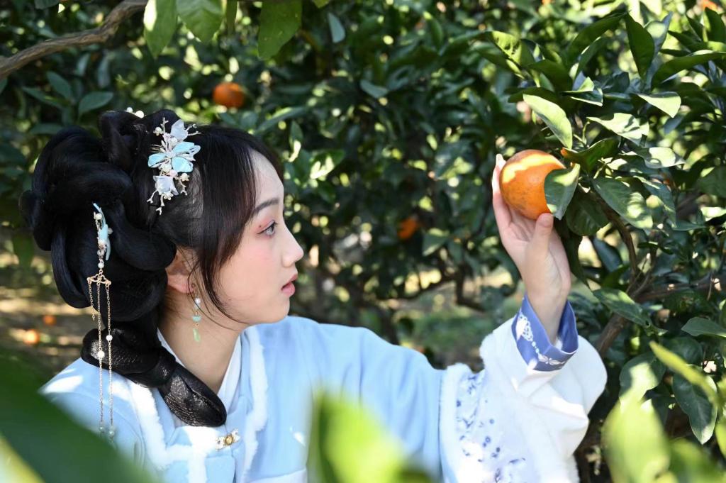 上午,汉服社的同学们身着汉服在橘树成荫下徜徉,化身橘子形象代言人。阳光透过树冠洒落,典雅的衣裙与红橘绿叶交相辉映,极具中国风韵的橘林汉服秀,吸引了当地村民纷纷驻足,对同学们的表现赞不绝口。摄影工作室的小伙伴们用镜头记录下这美妙画面。