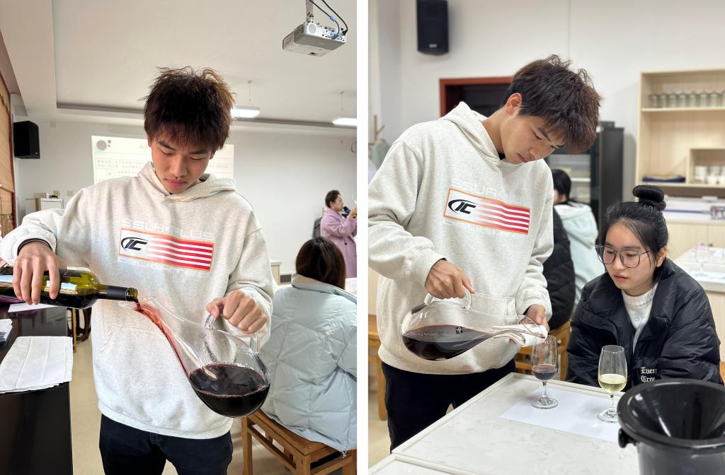 海洋旅游学院团委下设的海上侍酒师俱乐部的杨枭与刘小渊两位成员作为李春美研究员的小助手全程参与此次讲座。在鉴赏环节,他们配合老师完成了葡萄酒开瓶演示、侍酒布折叠与斟酒展示。作为本学期新成立的社团,两位成员的表现得到了李春美研究员的点赞肯定。此次讲座也受到了师生们的欢迎,纷纷表示希望以后能有更多的机会参与这类“理实一体”讲座培训。