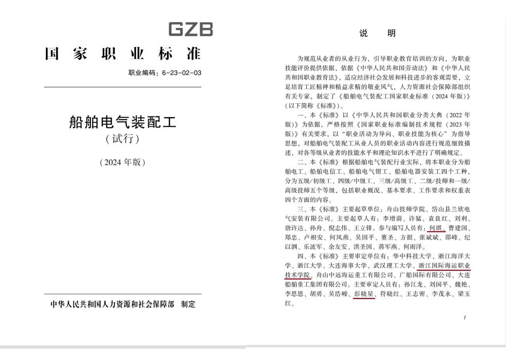 本《标准》主要主持起草单位为舟山技师学院,自20217月人力资源和社会保障部印发《国家职业技能标准制定工作计划(2020-2022年)》的补充通知起,学校何琪老师应邀作为第一参编人员加入标准制定,具体开展调研、编制、修订、评议等工作,为学校专业发展、职业培训、标准制定打下基础。此外学校航海工程学院彭晓星教授受邀参加本《标准》终期审定工作。(海洋装备工程学院)