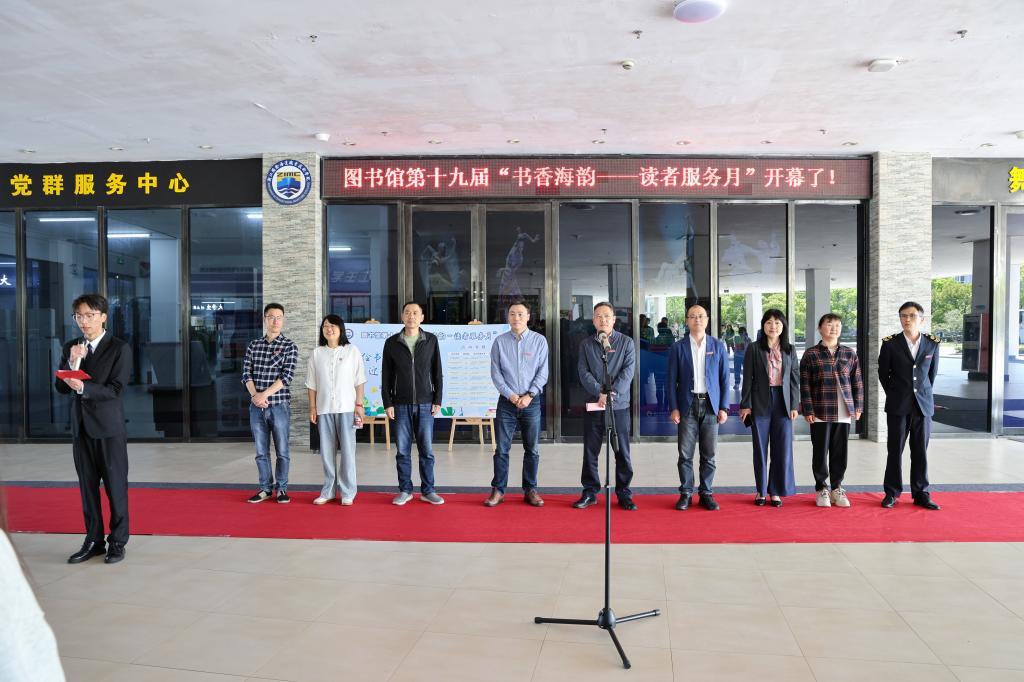 五月芳菲,亦是读书时。为深入学习贯彻习近平文化思想,强化图书馆文化育人、文化启人智能,学校图书馆举办“共绘书香十九芳韵,喜迎学校廿十华诞”为主题的读者服务月活动。58日下午,学校第十九届“书香海韵 读者服务月”阅读节开幕式在董浩云图书馆一楼大厅举行。校党委委员、副校长曹志斌出席开幕式并致辞。图书馆馆长吴平波主持开幕式,校图书馆、宣传部、校团委、科研与合作处、文化体育部、各二级学院负责人及部分师生读者出席了开幕仪式。