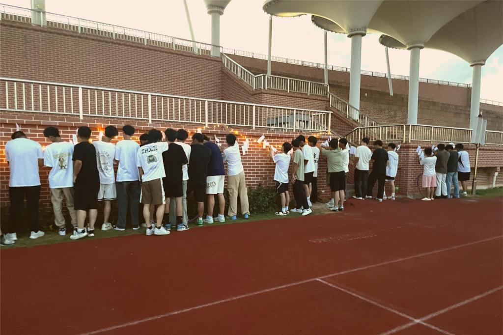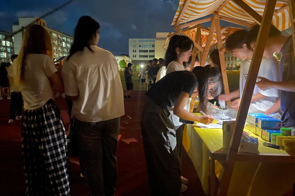 操场的一角,明亮的灯光与皎洁的月光交相辉映。同学们热情高涨,手持灯谜卡片,争相投入到谜底竞猜之中。猜对灯谜的同学们排着长队领取奖品,脸上洋溢着喜悦的笑容。明月高悬,活动现场弥漫着浓厚的节日气息。