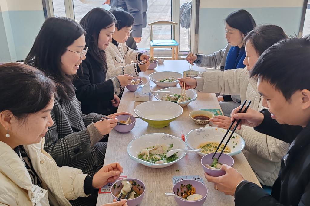 活动现场,食堂的餐桌上摆满了饺子皮和馅料,老师们纷纷卷起袖子,包饺子、话家常,场面热闹而温馨。