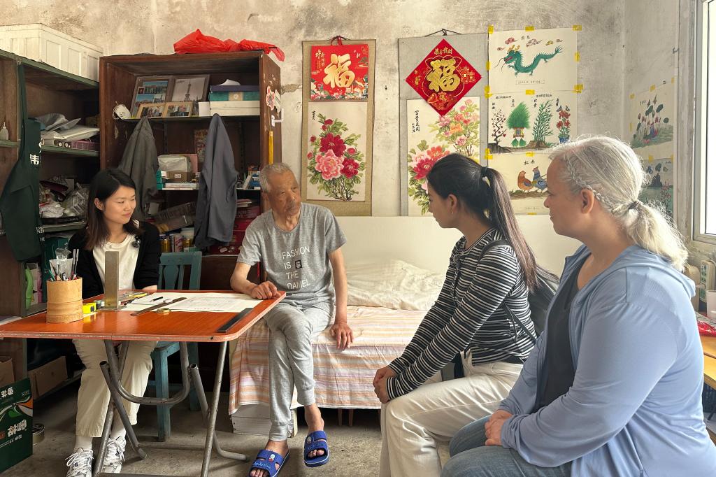 团队成员与“守望时光”海岛支老项目组深入交流,了解到这所曾承载几代岛民童年记忆的小学,如今化身为融合渔文化特色的托老所。团队还拜访了“渔民画家”胡华成阿公的家,85岁的老人颤巍巍地展示着自己多年以来坚持创作的“海味”画作,并将一幅舟山传统“绿眉毛”帆船画作赠予外教,这份独特的创作成为跨文化交流的特别礼物。