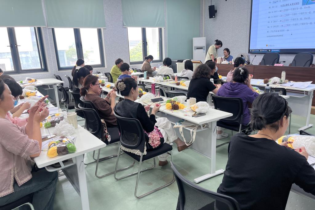 学院特邀原舟山航海学校高级讲师、编织钩针爱好者郑美芬老师为参训学员详细讲授手工钩织的起针、花型针法、颜色变换、收放针、线头处理等钩织全流程内容,从理论讲解到手把手教授,让大家受益匪浅。在学习过程中,学员们互相交流探讨、增进技艺,形成了彼此之间互通有无、互帮互助的良好氛围。