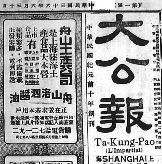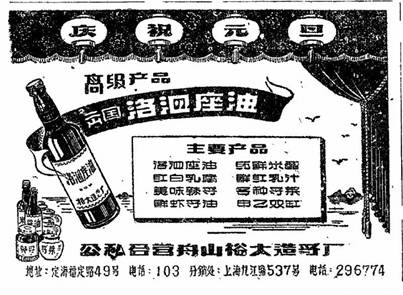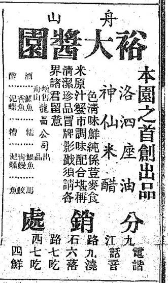 舟山同寿泰出品之洛泗油,驰誉五十年,为该地著名特产。其质料私毫不含药剂,纯系提取大豆、陈盐原汁精制,故风味鲜美,罕与伦匹。又有酸果名醋,乃采择鲜果酿制,味更鲜洁。该两种舟山土产,调味蘸食,无往不宜。兹因沪上嗜食者甚多,特设经理处于天津路长鑫里达记号内,电话购办,一律欢迎。电话九一九二七号。闻永安、大新两大公司,亦有代售。
