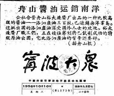 上海还有一份《民国日报》,也宣传过洛泗酱油。1921年5月21日的报纸曾经刊登《洛泗油驰名遐迩》的短文章,据文章介绍,上个世纪二十年代,同寿泰的酱油还曾经出口到英国,这说明定海洛泗酱油受到英国人的喜欢,美味的洛泗酱油甚至传播到遥远的欧洲。到民国三十六年(1947),上海鲍氏洋行购定海裕大官酱园洛泗座油58吨,分六批出口南洋。看来解放前洛泗酱油的出口数量也非常巨大。洛泗酱油,可谓驰名中外。