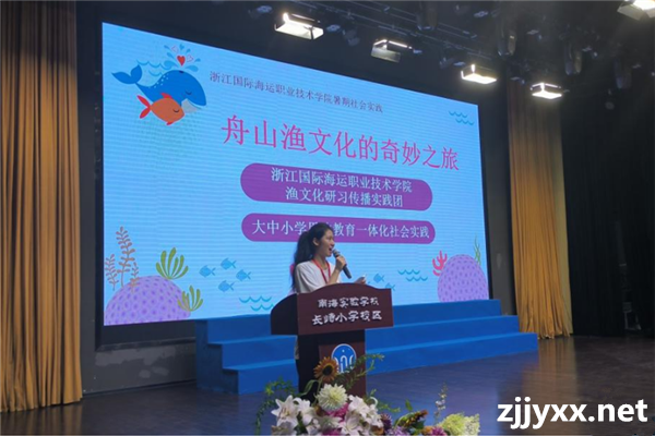 在宣讲活动中,暑期社会实践团成员何燕圆同学向全校师生介绍了舟山渔民号子、舟山锣鼓、舟山渔民画、舟山地方谚语等具有鲜明地方特色的渔文化。