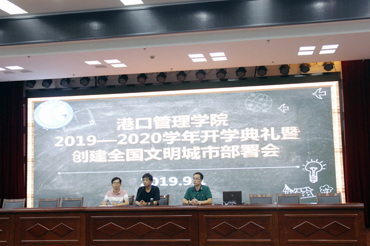 9月1日晚,港口管理学院在图书馆四楼报告厅召开2019-2020学年开学典礼暨创建全国文明城市工作部署会。会议由港口管理学院书记苏峰主持,学院党政班子、辅导员、全体2018级学生共400余人参加。