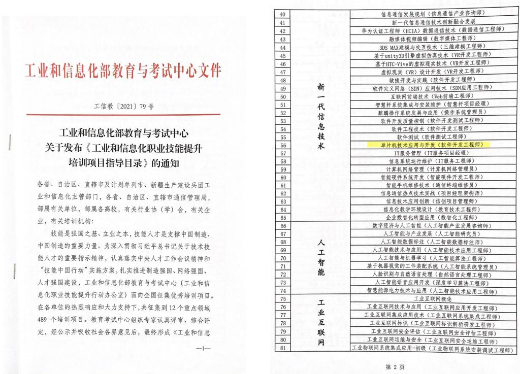近日,海洋装备工程学院的“单片机技术应用与开发(软件开发工程师)”培训项目,经工业和信息化部教育与考试中心组织的专家评审、综合评定,顺利入选《工业和信息化职业技能提升培训项目指导目录》(工信教〔2021〕79号)。