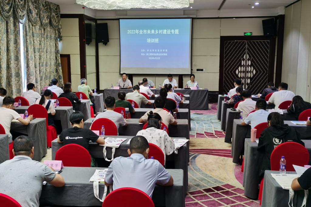 为贯彻落实全省共同富裕现代化基本单元建设推进会精神,高水平推进我市未来乡村建设,全力打造共同富裕大场景下的未来乡村海岛样板,由舟山市农业农村局主办、舟山市乡村振兴学院承办的2022 年全市未来乡村建设专题培训班在新城顺利开班。浙江省现代化研究院副院长项晓晖、市农业农村局副局长叶激华、市乡村振兴学院执行副院长夏志刚与来自县区、乡镇、乡村等48名负责人共同参加了开班仪式。仪式由市农业农村局社会事业促进处处长余海芳主持。